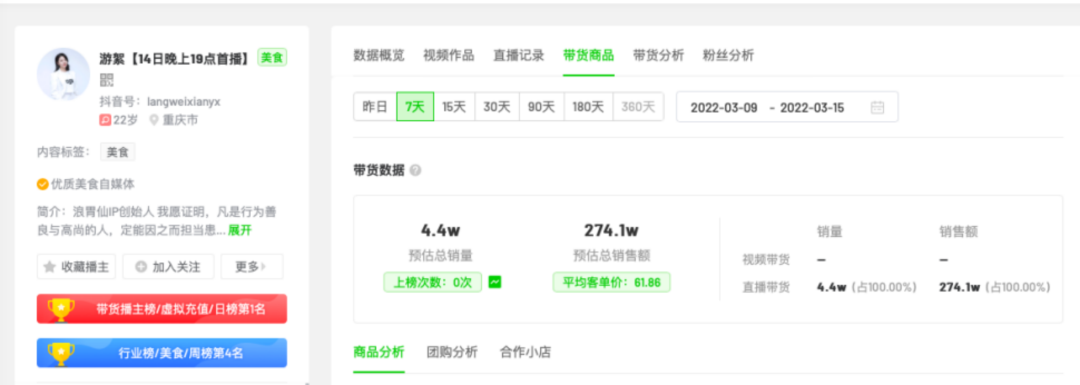 連播6個小時,一度躋身抖音帶貨榜第二,銷量4.4萬,銷售額274.1萬。這是游絮交出的成績單。
