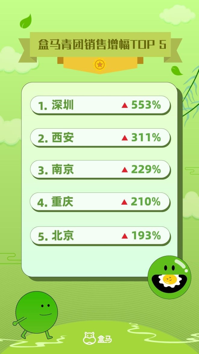 今年2月中旬盒馬啟動青團季,截至目前,深圳、西安、南京、重慶、北京是青團銷售額增幅TOP5,增幅最大的深圳、西安,比去年同期增長了553%、311%。足見江浙滬以外區(qū)域消費者對青團的熱情。