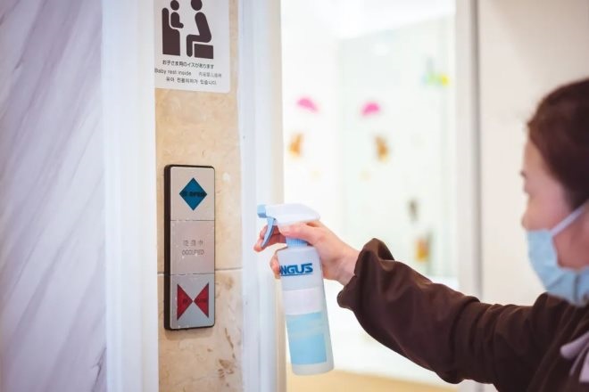 前灘太古里對商場內(nèi)所有手扶梯、電梯按鍵、門把手及洗手間,堅持每兩小時循環(huán)消殺一次。為了加強消毒防疫,在大部分扶手帶安裝了智能紫外線殺菌裝置,對扶手帶進行實時殺菌。同時,在所有客梯、洗手間噴灑Forest Cure?消殺防護植萃精華,在每日運營結(jié)束后,進行全場全面消毒,確保公共區(qū)域衛(wèi)生健康。