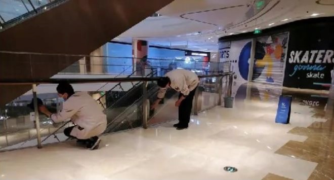 商場內(nèi)正在進行定時定點消毒,對公共區(qū)域及設(shè)施如電梯間按鈕、扶梯扶手、觸摸屏、公共垃圾桶等,每日全面消毒不少于三次,公用洗手間每日清潔消毒不少于三次,門把手、水龍頭、開關(guān)等消毒至少每兩小時一次。在廣場內(nèi)使用推塵消殺兩用機器人,一天兩次以次氯酸消毒水全場景消殺防護,中央空調(diào)系統(tǒng)采用與方艙醫(yī)院相同的納米光催化及當前先進的靜電消殺兩大系統(tǒng)。