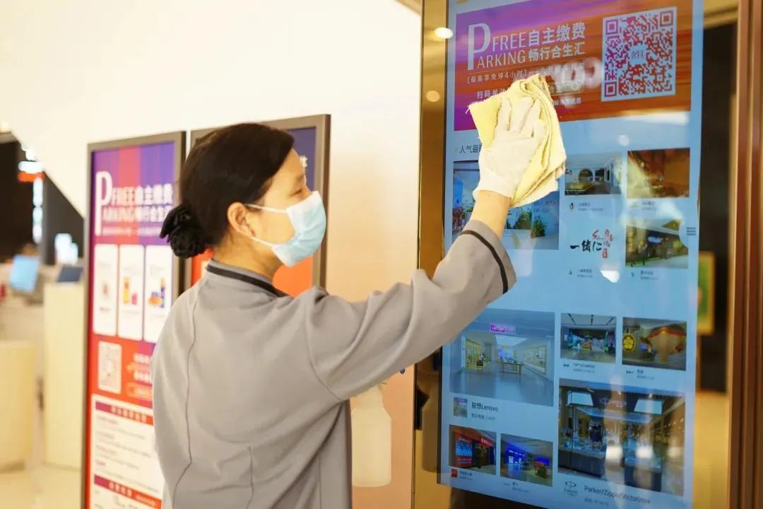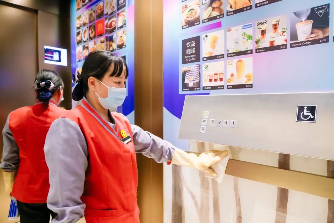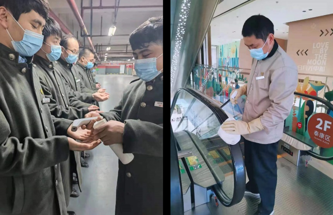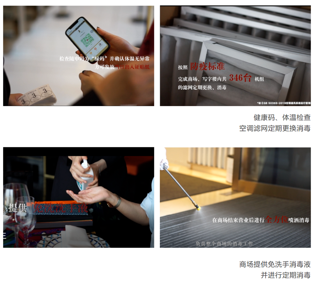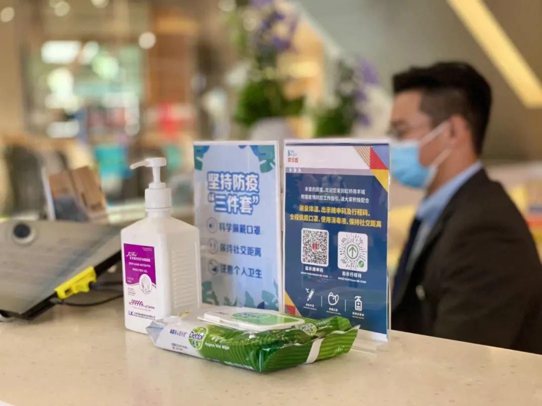 商場、寫字樓、停車庫入口設(shè)立各類進場人員測溫、健康碼查驗等工作,并提示正確佩戴口罩入場;提高商場內(nèi)各公共區(qū)域的深度清潔與消毒頻次并記錄明示,位置包括但不限于電梯扶手、升降梯按鍵、門把手、護欄、洗手間、母嬰室等,保證室內(nèi)區(qū)域空氣流通;商場及寫字樓主入口均設(shè)有自助免洗消毒設(shè)備,服務(wù)臺配備防護口罩等必要防疫物資,方便消費者領(lǐng)取使用。