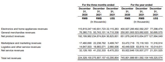 至于日用百貨品類,Q4 京東以日用百貨商品為代表的一般商品收入同比增長了 22.7%,在產(chǎn)品收入中占比達(dá) 39.95%。2021 年全年,在產(chǎn)品收入中占比 39.6%,與 2020 年的 38.5% 相比基本持平。