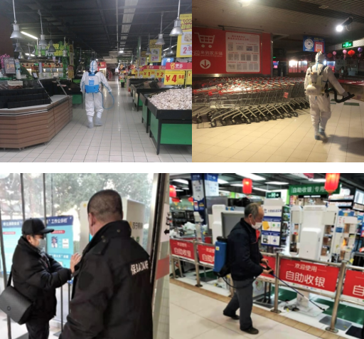 (圖:定時(shí)對(duì)賣場(chǎng)進(jìn)行消毒殺菌 家樂福工作人員堅(jiān)守一線)