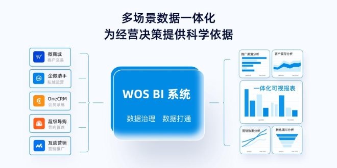 以實(shí)現(xiàn)“多場景數(shù)據(jù)一體化,為企業(yè)經(jīng)營決策提供科學(xué)依據(jù)”為例,微盟WOS的發(fā)布,可將交易、會員、導(dǎo)購、營銷等所有產(chǎn)品的底層進(jìn)行了打通,從底層即實(shí)現(xiàn)了有效的數(shù)據(jù)融通,將數(shù)據(jù)清洗、分析后,經(jīng)過BI系統(tǒng),即可將數(shù)據(jù)進(jìn)行可視化呈現(xiàn)成為企業(yè)經(jīng)營決策的科學(xué)依據(jù)。而微盟WOS天然的開放和連接屬性,則可以讓企業(yè)的數(shù)據(jù)應(yīng)用系統(tǒng)能夠快捷高效的與微盟WOS實(shí)現(xiàn)連接,從而獲取到更加全面的數(shù)據(jù)維度,讓數(shù)據(jù)在業(yè)務(wù)的全鏈路、全場景、一體化中真正發(fā)揮驅(qū)動(dòng)業(yè)務(wù)增長的價(jià)值。