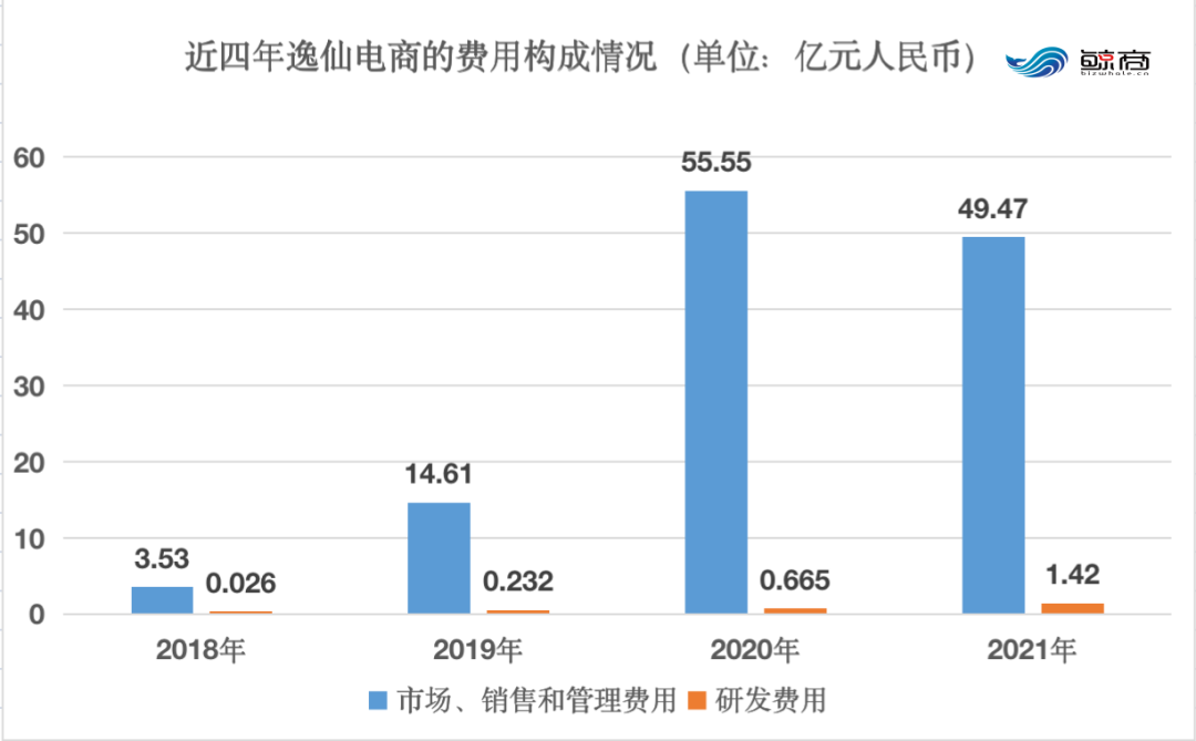 逸仙電商虧損已持續(xù)多年。從2018年至2020年,其凈虧損分別為0.4億元、0.8億元、26.9億元。連年虧損背后,主要是因?yàn)闋I銷費(fèi)用逐年走高。2019年、2020年、2021年分別為12.5億元、34.1億元、40.06億元,同比增長分別為305%、172%、17.5%。
