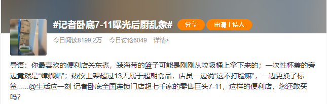 315當天,7-11便利店被曝出關(guān)東煮食材被放在垃圾桶上、超期熱飲被更換日期標簽等食品安全問題。在被曝光后,該事件很快沖上了微博熱搜榜榜首。