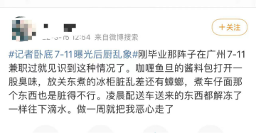 “剛畢業(yè)那陣子在廣州7-11兼職過就見識到這種情況了。咖喱魚蛋的醬料包打開一股臭味,放關(guān)東煮的冰柜臟亂差還有蟑螂,煮車仔面那個東西也臟得不行。凌晨配送車送來的東西都解凍了一樣往下滴水。做一周就把我惡心走了”、“猶記得,我上次在7-11土豆泥蔬菜沙拉里吃出了短黑粗的那種毛毛”、“算了,以后不買熟食了”……