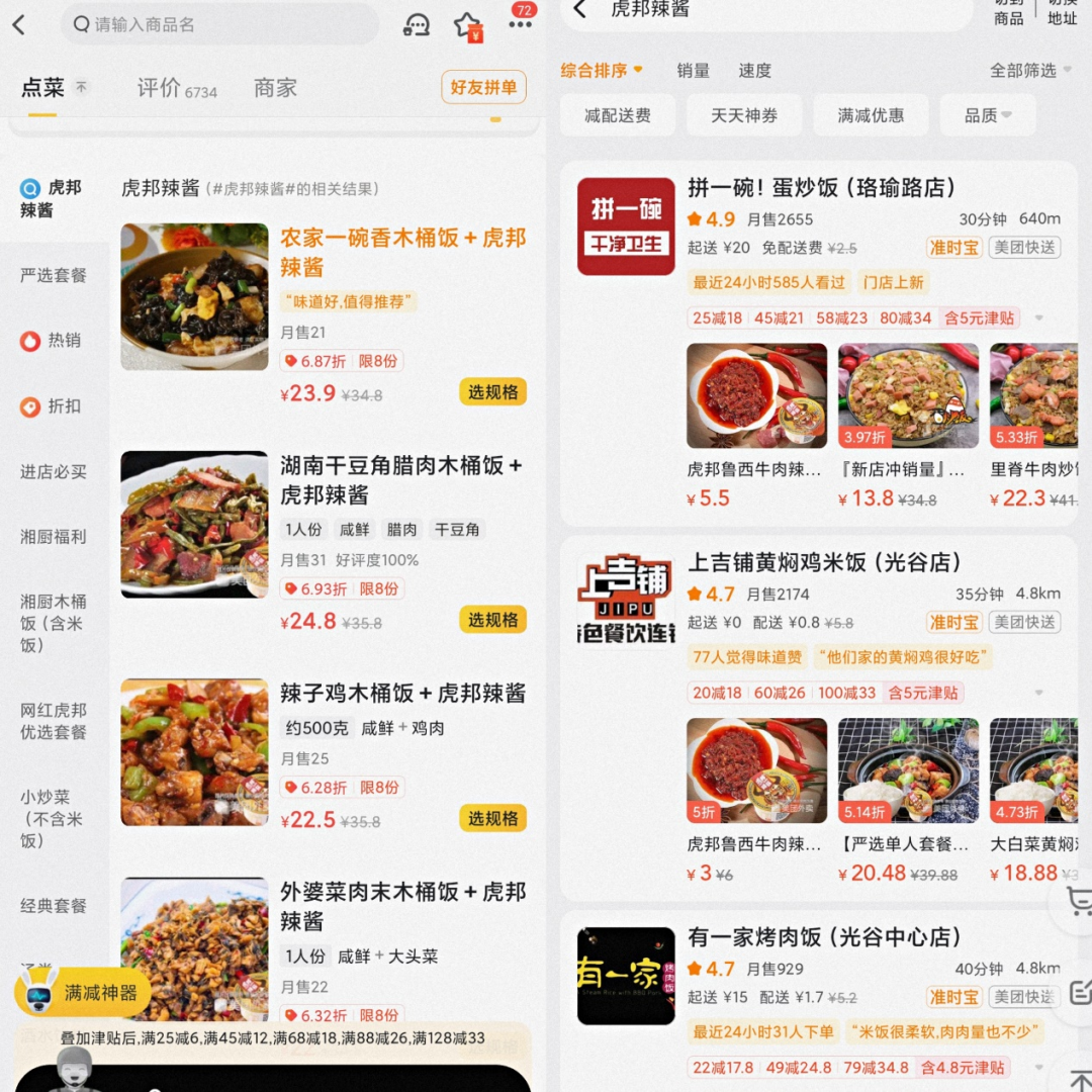 我們點(diǎn)開美團(tuán)進(jìn)入外賣窗口,搜索虎邦辣醬,頁面彈出的窗口出現(xiàn)不少商家,但這些商家并不是主賣辣醬,而是與頁面菜單的菜品深度綁定。