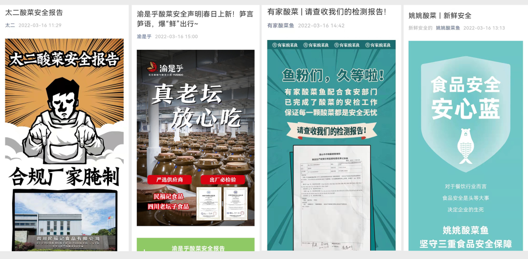 3月16日,太二酸菜魚、魚你在一起、有家酸菜魚、渝是乎等主營酸菜魚品類的餐飲企業(yè)紛紛發(fā)布公告聲明,并公布自己的食材供應鏈以及質(zhì)量檢測報告。這也給餐飲人們上了一節(jié)很好的“危機公關(guān)課”。
