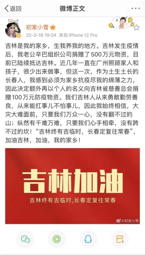 初瑞雪在微博中說:“吉林是我的家鄉(xiāng),生我養(yǎng)我的地方。吉林發(fā)生疫情后,我老公辛巴組織公司捐贈(zèng)了500萬元物資,目前已陸續(xù)抵達(dá)吉林。近幾年一直在廣州照顧家人和孩子,很少出來做事,但這一次,作為土生土長的長春人,我感到必須為家鄉(xiāng)抗疫盡我的綿薄之力,因此決定額外再以個(gè)人的名義向吉林省慈善總會捐贈(zèng)100萬元防疫物資。我們吉林人從來勇敢勤勞善良,從來能扛事兒不怕事兒,因此我始終相信,大災(zāi)大難面前,只要我們?nèi)f眾一心,沒有翻不過的山;縱然有千難萬難,只要我們心手相牽,沒有跨不過的坎!‘吉林終有吉臨時(shí),長春定復(fù)往常春’,加油吉林,加油,我的家鄉(xiāng)!”