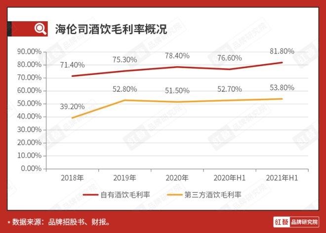 自2018年起,海倫司開始推出自有產(chǎn)品。在酒類行業(yè)產(chǎn)能相對(duì)過剩的情況下,海倫司直接通過第三方廠商代工,從而去除中間商環(huán)節(jié),實(shí)現(xiàn)了較高的毛利率。據(jù)海倫司招股書,自有產(chǎn)品剛推出的2018年,其毛利率便達(dá)71.4%,是第三方產(chǎn)品毛利率(39.2%)的1.8倍。