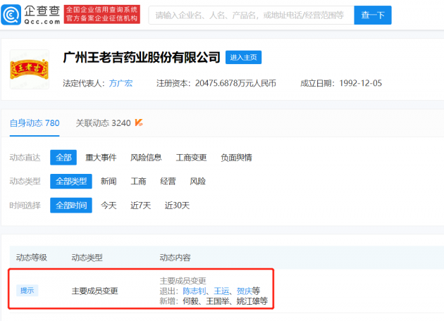 聯(lián)商快訊:企查查APP顯示,近日,廣州王老吉藥業(yè)股份有限公司發(fā)生工商變更,陳志釗、賀慶、王運(yùn)、鄭榮波退出公司董事,新增邢絢琛、何毅、王國(guó)舉、姚江雄擔(dān)任董事職務(wù)。企查查信息顯示,該公司成立于1992年12月,注冊(cè)資本約2.05億元,董事長(zhǎng)兼總經(jīng)理、法定代表人為方廣宏。