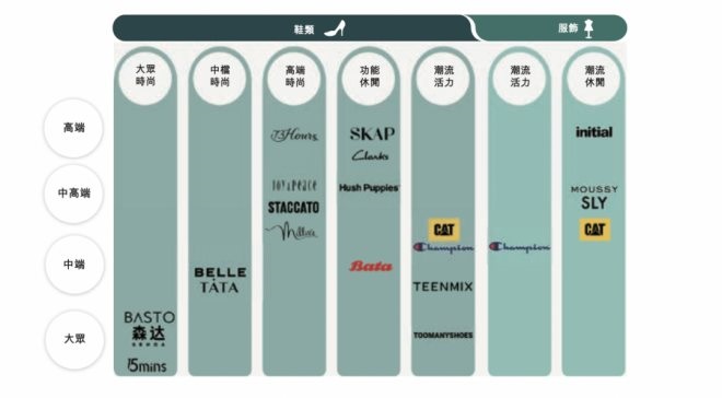 具體來看,分別為定位于大眾市場的BASTO、SENDA、15mins,中端時尚的BELLE、TATA,高端時尚的STACCATO、73Hours、Joy&Peace、Millie's,功能休閑的SKAP、Hush Puppies、Bata、Clarks,潮流活力的TEENMIX、Champion、TOOMANYSHOES、CAT。