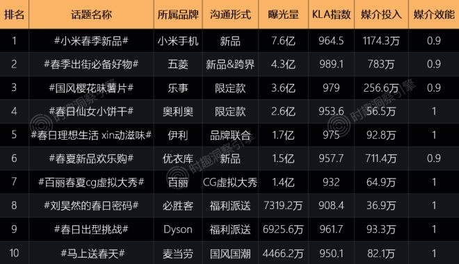 根據(jù)時趣洞察引擎數(shù)據(jù)顯示,2021年春季營銷戰(zhàn)役榜單top10品牌有小米手機、五菱、樂事、奧利奧、伊利、優(yōu)衣庫、百麗、必勝客、Dyson、麥當勞,主要的溝通形式是推出新品、福利派送、跨界聯(lián)名等。