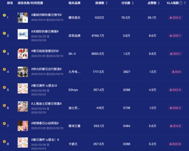 根據(jù)時趣洞察引擎檢索品牌#春日#戰(zhàn)役數(shù)據(jù)顯示,近三個月上榜的品牌有騰訊音樂、蘇菲品牌、SK-II、九號電動車、52toys、迪士尼、雅詩蘭黛、卡姿蘭,這些品牌的社交話題也都在依據(jù)春季場景進行關(guān)聯(lián)。
