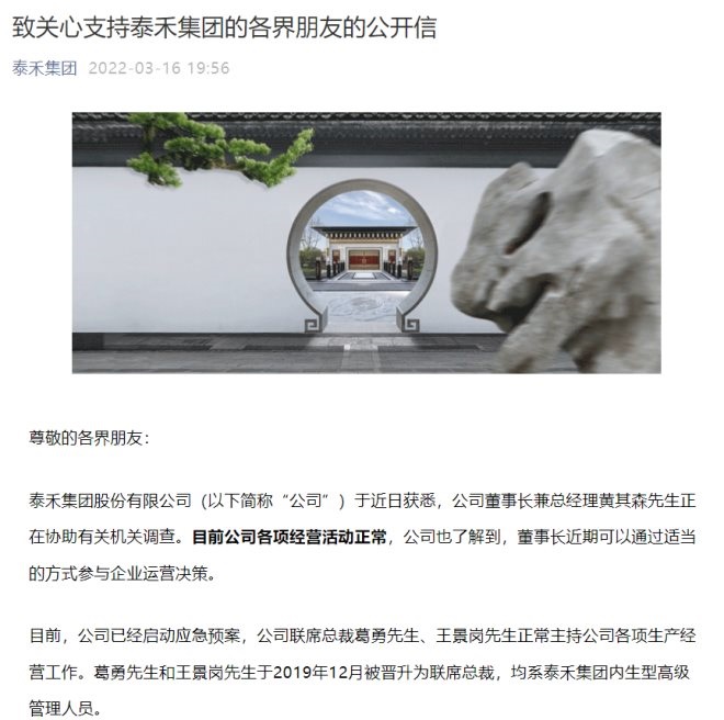 同時,泰禾還在微信公眾號發(fā)布公開信表示,“目前公司各項經(jīng)營活動正常,公司也了解到,董事長近期可以通過適當(dāng)?shù)姆绞絽⑴c企業(yè)運營決策!