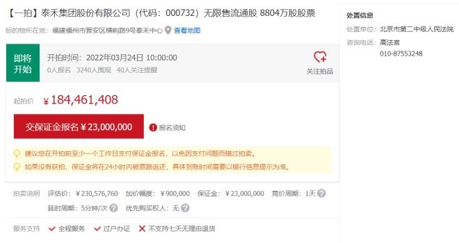 在京東網(wǎng)絡(luò)司法拍賣平臺上,泰禾無限售流通股8804萬股股票也將于3月24日上午10時開始第一次拍賣,起拍價約1.84億元,處置單位為北京市第二中級人民法院。