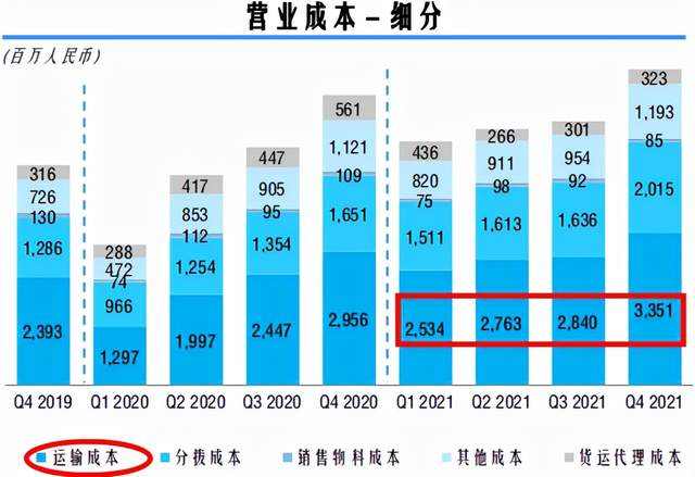 2021年,因?yàn)橐咔、通貨膨脹等原因,促使原油價(jià)格上漲,進(jìn)而導(dǎo)致了國(guó)內(nèi)汽油價(jià)格同步上漲,快遞公司運(yùn)輸成本上漲。而Q4因俄烏沖突等原因,成本上漲現(xiàn)象反映明顯。