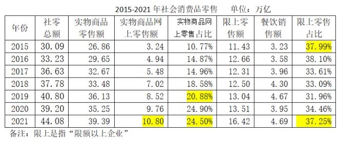 我覺得還沒有,除非有更嚴(yán)厲的政策規(guī)制出臺。2019年實物商品網(wǎng)上零售占比首次突破20%(20.88%),2020年因為疫情影響,這個占比飆升至24.90%(約占1/4)。2021年回落到24.50%。但我認(rèn)為,還會繼續(xù)提高,原因只有一個:消費習(xí)慣改變了。年輕人越來越往網(wǎng)上走,連我們這樣年齡的人,一天在家也常常能收到3、4個快遞。另一個數(shù)據(jù)是:限上(限額以上單位)銷售占比發(fā)生了扭轉(zhuǎn)。2021年達(dá)到37.25%,基本回歸到2015年的水平。規(guī)模稍大的企業(yè)的市場份額不斷擴(kuò)大,這才是零售的未來。至于線上還是線下,以后會越來越模糊。所以,不要從某個時點看變化,要從趨勢看變化。如表1所示。