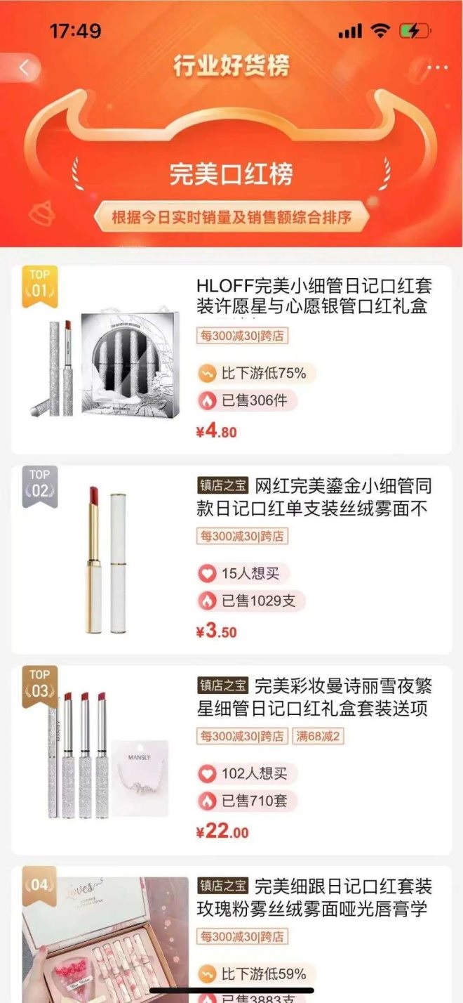 在行業(yè)好貨榜“完美口紅榜”中,TOP4都是“完美日記小細(xì)跟平替”,價(jià)格低至3.5元,銷(xiāo)量一千多支。