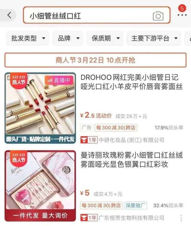 一些小作坊打著“網(wǎng)紅同款”的旗號(hào),“小細(xì)管絲絨口紅”更是明目張膽地在平臺(tái)上兜售,價(jià)格低至2.5元。
