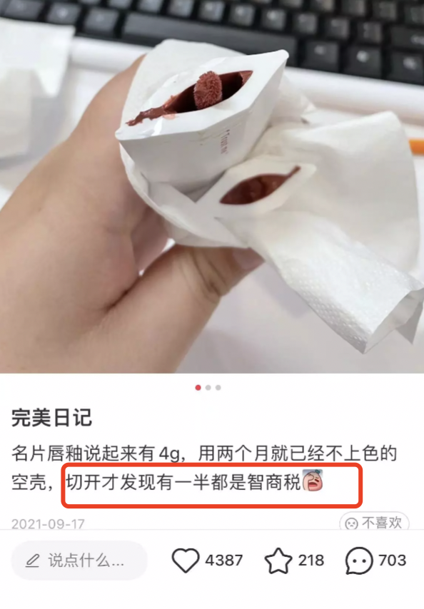 有小紅書(shū)博主表示,另一款完美日記爆款名片唇釉,說(shuō)好的有4g,實(shí)際上用起來(lái)兩個(gè)月就已經(jīng)不上色。