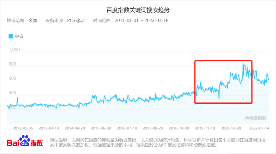百度指數(shù)顯示,“中古”一詞的搜索趨勢(shì)在近兩年攀升