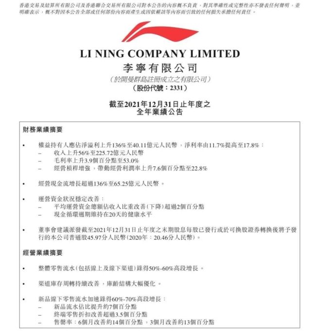 3月18日,李寧發(fā)布了2021年的全年業(yè)績公告,多項數(shù)據(jù)表現(xiàn)不俗。