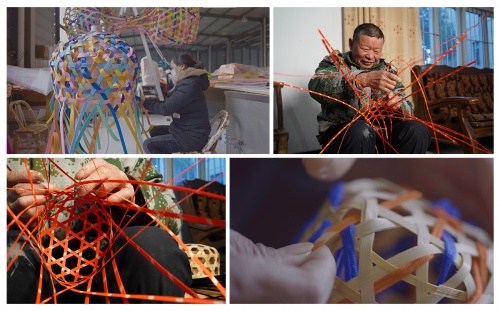 「蟈蟈虎」由來自杭州青山村的手工藝人在中國傳統(tǒng)的竹制六角編基礎上,穿插毛氈、毛線、綁帶、噴漆等手工技藝制作,并充分利用江南布衣集團的往季庫存布料,在保留傳統(tǒng)編織作品自然之美的同時為藝術裝置注入新的生命。