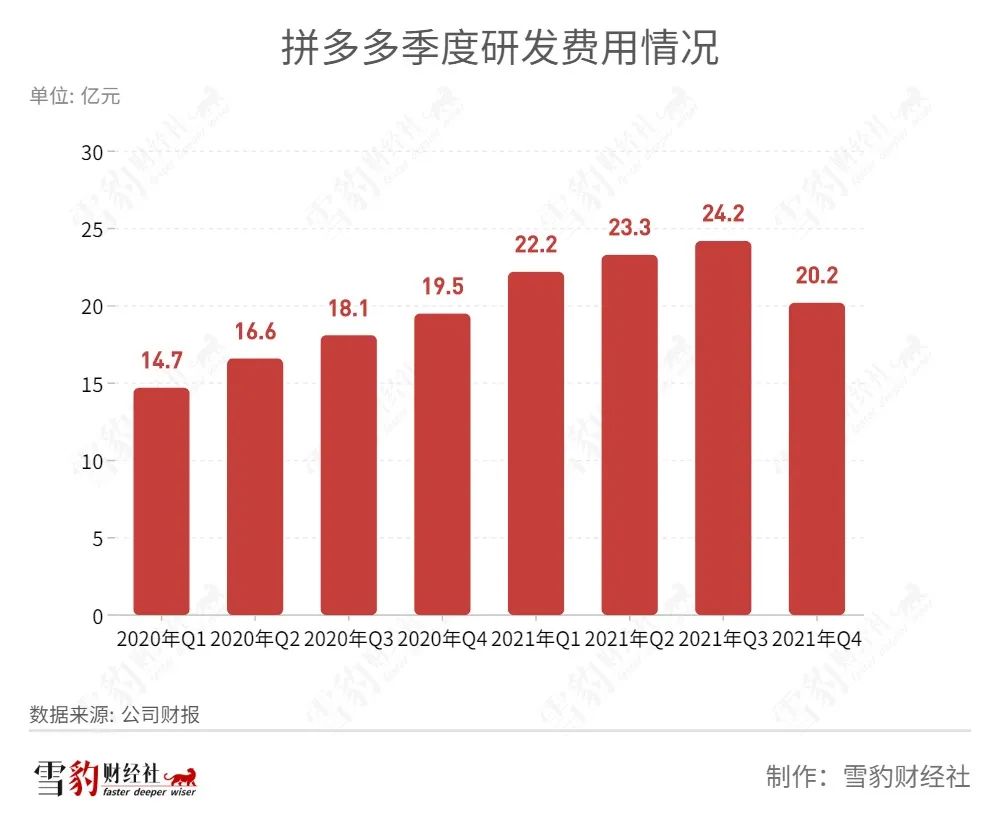 拼多多對(duì)研發(fā)的投入依然在不斷增加。Q4財(cái)報(bào)中,拼多多的研發(fā)費(fèi)用為20.23億元,同比增加4%。拼多多2021年四個(gè)季度的研發(fā)費(fèi)用,除Q4外,均環(huán)比增長(zhǎng)。