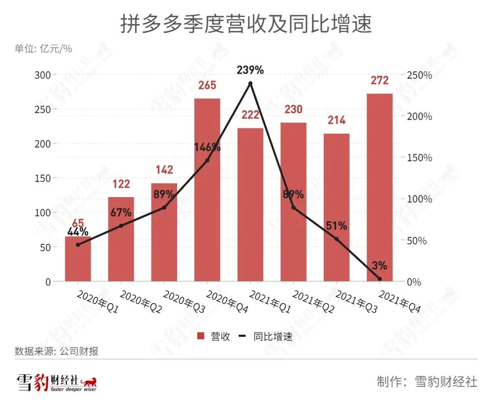 據(jù)財(cái)報(bào),拼多多2021年Q4營(yíng)收272.31億元人民幣,同比增長(zhǎng)3%;凈利潤(rùn)66.2億元,上年同期凈虧損13.76億元。2021年全年,營(yíng)收939.5億,同比增長(zhǎng)58%;凈利潤(rùn)77.69億元,上年度虧損71.8億元。2021年全年總成交額(GMV)達(dá)到24410億,同比增長(zhǎng)46%。