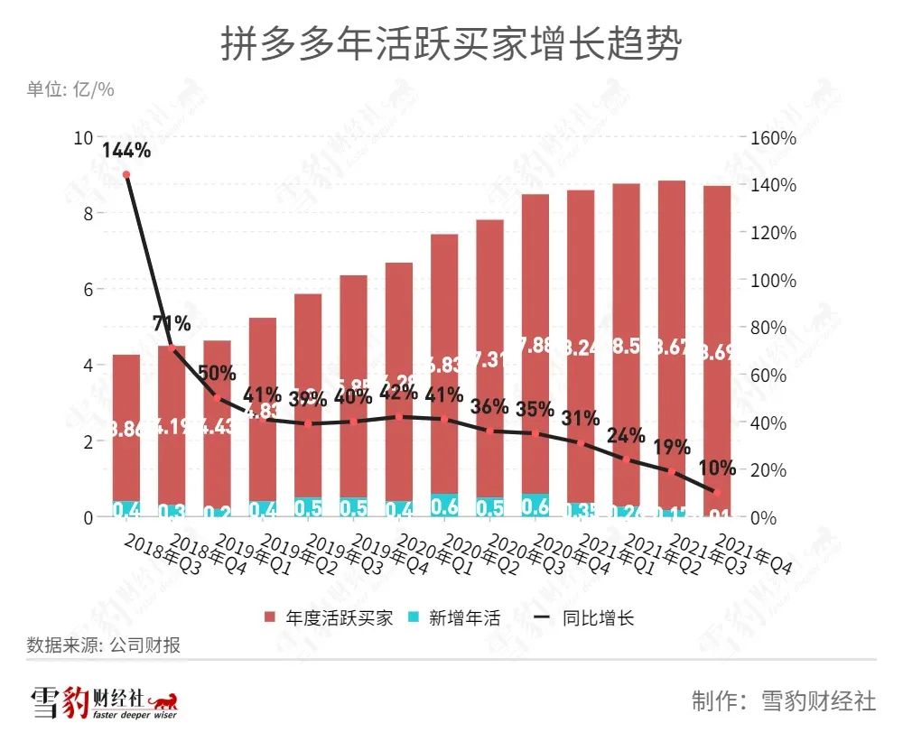 截至2021年Q4,拼多多年度活躍買(mǎi)家為8.687億,較Q3的8.673億凈增140萬(wàn)。這也是2018年7月拼多多上市以后,凈增年度活躍買(mǎi)家數(shù)最少的一個(gè)季度。