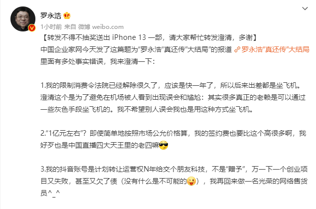 3月21日下午,羅永浩在1個(gè)小時(shí)內(nèi)連發(fā)9條微博,對此前傳出的“羅永浩最早將在下個(gè)月徹底還完債務(wù)”的消息進(jìn)行辟謠。為此,其還采取了轉(zhuǎn)發(fā)抽獎(jiǎng)送一部iPhone 13的方式,邀請網(wǎng)友們幫忙澄清。