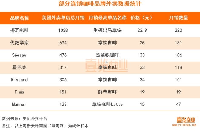 從美團(tuán)外賣的公開數(shù)據(jù)看,代數(shù)學(xué)家頗受消費(fèi)者歡迎。壹覽商業(yè)以上海新天地商圈作為單位,統(tǒng)計(jì)了這7家在美團(tuán)外賣上的數(shù)據(jù)。在月銷上,代數(shù)學(xué)家表現(xiàn)優(yōu)異,共694單排名第二。第一的是挪瓦咖啡,月銷1038單。在月銷最高產(chǎn)品上,7家品牌有6家都是拿鐵咖啡,其中代數(shù)學(xué)家的拿鐵月銷181單,依舊位居第二,挪瓦的生椰出馬拿鐵月銷220單,位居第一。
