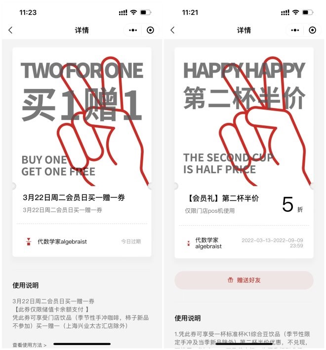 值得一提的是,代數(shù)學(xué)家為了吸引用戶到店,安排了星期二會(huì)員如到店消費(fèi)買一贈(zèng)一、以及第二杯半價(jià)的活動(dòng)。