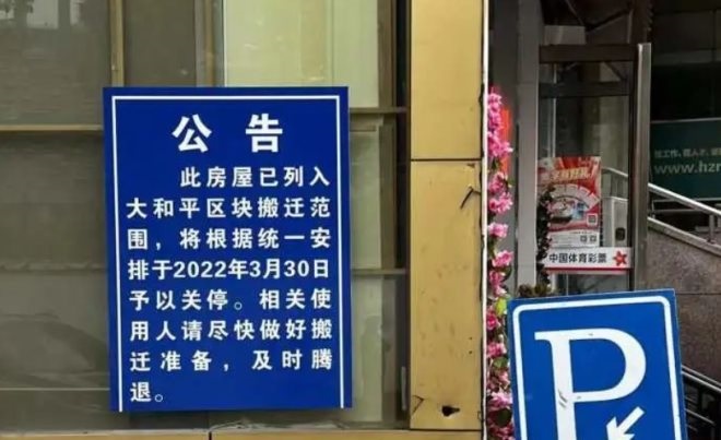 不過(guò),門店所在區(qū)塊拆遷公告牌上顯示,此房屋已列入大和平區(qū)塊搬遷范圍,將根據(jù)統(tǒng)一安排于2022年3月30日予以關(guān)停。