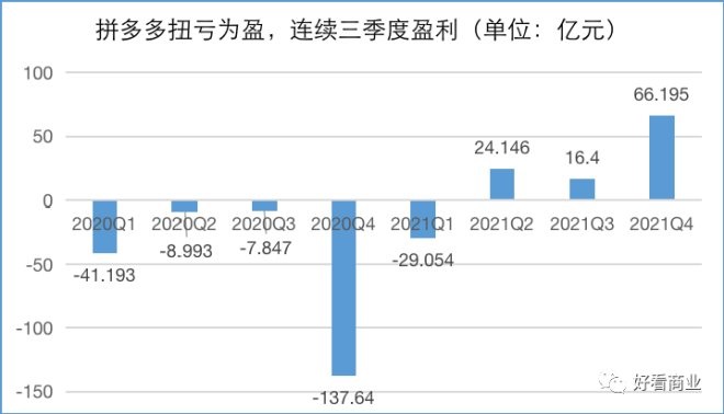 不過,拼多多在Q4達到了上市以來盈利的最高水平:該季凈利潤66.195億元,遠高于市場預估,這也是拼多多上市至今連續(xù)第三個季度盈利。