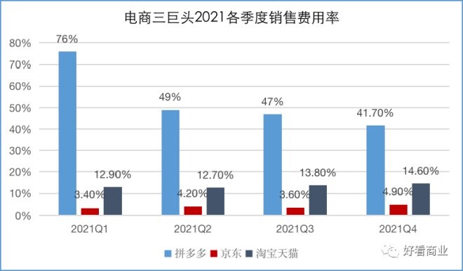從財報看,拼多多運營開支中占比最大的部分——消費費用在2021年各季不斷下降:銷售費用率從Q1的76%一路降至41.7%。