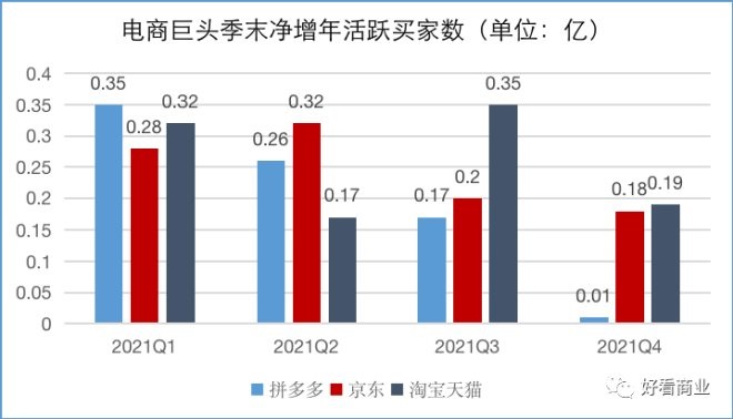 橫向比較淘寶天貓和京東,拼多多在活躍買家增長方面更是相形見絀。2021年Q4,淘寶天貓、京東的年活躍買家分別較上個季度新增1900萬和1800萬。