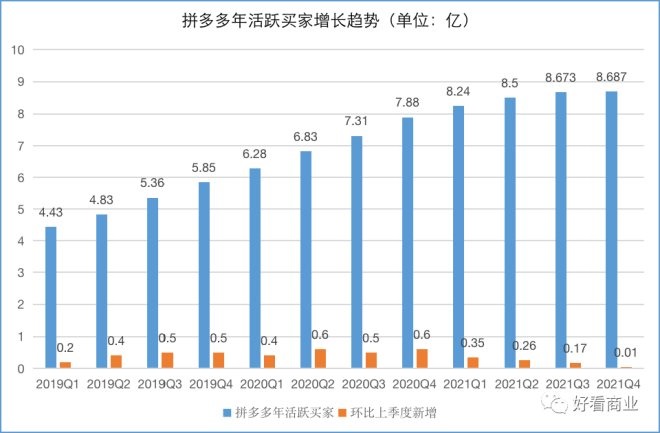 財報顯示,2021年Q4,拼多多年活躍買家達8.687億,環(huán)比上個季度僅新增100萬,為環(huán)比新增表現(xiàn)最差的一個季度。
