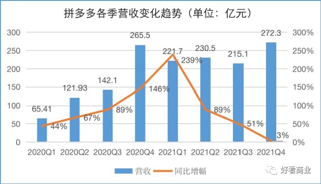 2021全年,拼多多實現(xiàn)營收939.5億元,同比增長51%;遠低于去年的97%。