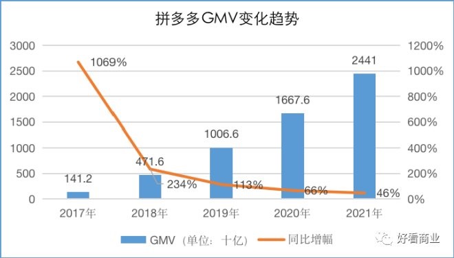從2021年Q1開始,拼多多不再披露季度GMV。整個2021年,拼多多實現(xiàn)GMV24410億元,同比上年增長46%,增速為上市以來最低。2017-2020年,其GMV的同比增速分別為:1069%、234%、113%和66%。