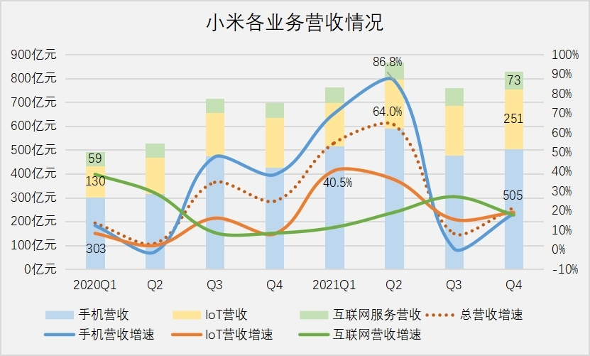 第四季度,小米手機業(yè)務實現(xiàn)營收505億元,同比增長18.4%,IoT營收251元,同比增長19.1%,二者在總營收的權(quán)重高達88.3%,全年營收占比為89.2%。值得一提的是,手機業(yè)務營收對整體營收的牽引力巨大,但是在毛利率方面卻與互聯(lián)網(wǎng)服務差距不大。