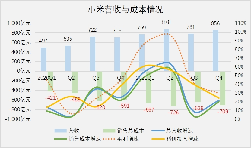 2020年至2021年年初,小米集中在一、二線城市采取自建直營的“千店計劃”,迅速推高了銷售成本。隨著千店計劃告一段落,成本將得到有效控制。去年盧偉冰祭出面向下沉市場的“萬店計劃”,通過授權(quán)的輕資產(chǎn)方式擴張,對于未來成本的影響有限。