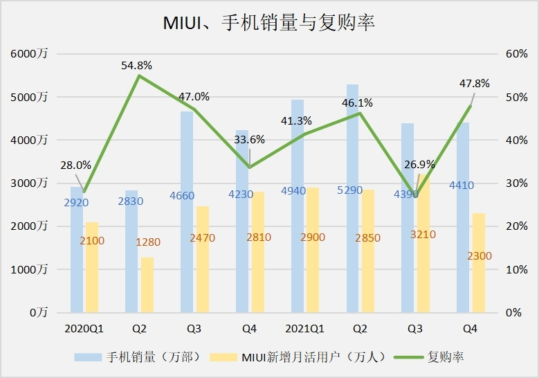 值得慶幸的是,復購率在去年第四季度回暖,可能一部分原因是小米12即將上市,米11、11ultra等高端機型的性價比策略,以及雙11大促,重新拉回了米粉。