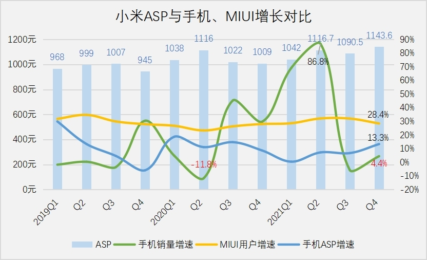 手機ASP是觀測小米高端化的核心指標,截至去年第四季度,小米ASP為1143.6元,同比增長13.3%。值得注意的是,最近兩年的二季度是小米ASP的峰值,這與復購率的峰值完全重合,說明提升ASP不能靠新用戶,只能依靠米粉。
