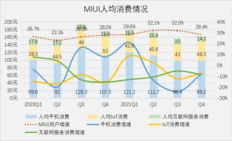小米硬強于軟的情況,疊加MIUI用戶高速增長,使得人均季度消費不斷走低。去年四個季度,MIUI人均消費分別為179.4元、172.7元、156.4元、162.8元,最近六個季度呈下滑態(tài)勢。一部分原因是國內(nèi)電子消費市場,特別是手機行業(yè)下行。