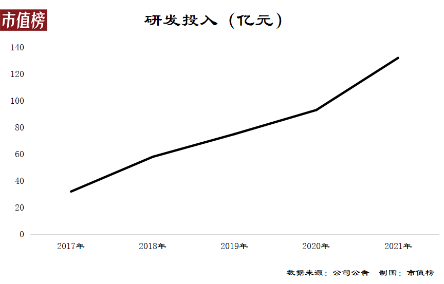 小米的研發(fā)投入從2017年的32億元增長(zhǎng)到2021年的132億元,其中2021年同比增長(zhǎng)42.3%,研發(fā)投入進(jìn)入了中國(guó)高科技公司的前20位。