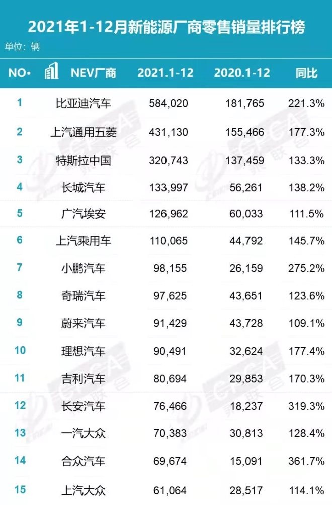 圖/2021年1-12月新能源廠商零售銷量 來源/乘聯(lián)會(huì)
