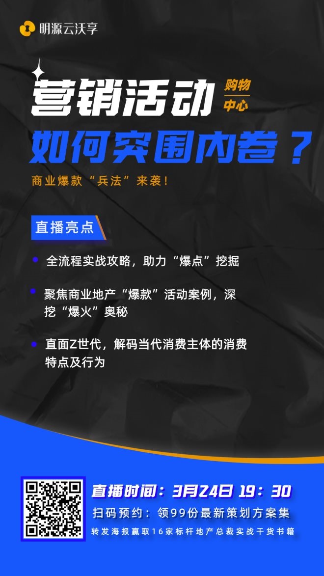 為更好地購物中心營銷提供更多創(chuàng)新思路,3月24日下午19:30-21:30,明源云沃享將在直播間為大家分享購物中心突圍營銷內(nèi)卷的“爆款”制勝兵法,以期為營銷活動打造提供答疑解惑,提供新思路。誠邀您觀看!